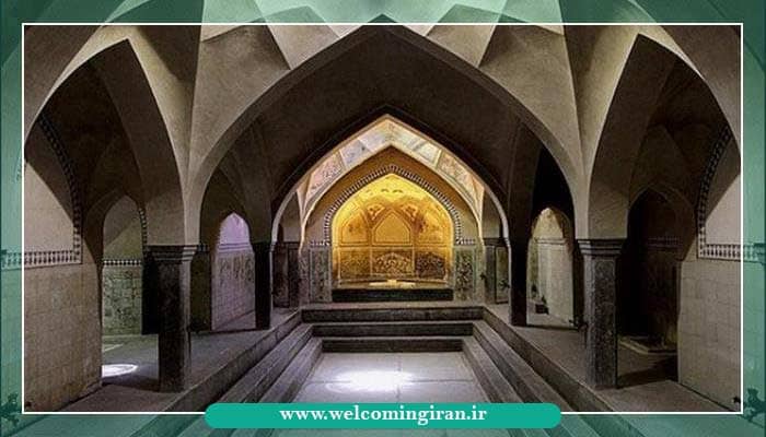 تزئینات سقف به صورت رسمی بندی است و نورگیرهای سقف از فضای اطراف به سمت مرکز سقف به صورت منظم طراحی شده اند که در مواقع مختلف روز با ایجاد سایه روشن بر زیبایی تزئینات سقف می افزاید. این بنا به صورت موزه مردم شناسی در معرض دید عموم گردشگران قرار دارد. از ویژگی های خاص و معماری این حمام تزئینات زیبایی است که از سه دوره ی صفوی، قاجاریه و پهلوی شکل گرفته و اکنون جزئی از این بنا هستند.