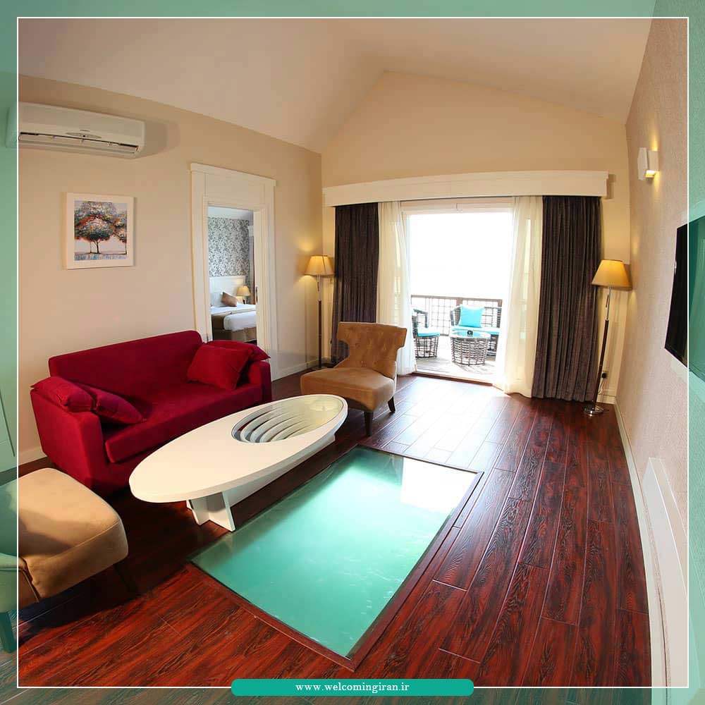سوئیت امپریال که بزرگترین واحد هتل با ۱۲۰ متر مربع است، شامل دو اتاق خواب مستر، یک سالن نشیمن و دو بالکن است که یکی از بالکنها دارای وان حمام با نمایی رو به دریاست. سوئیتهای رویال نیز با مساحت ۶۰ متر مربع در دو نوع با چشمانداز رو به دریا و رو به غروب ارائه میشوند که نوع رو به غروب قیمت بالاتری دارد و دارای کاناپه تختخوابشو و تراسی دنج برای تماشای مناظر است. اتاقهای دو تخته که کوچکتر هستند، طراحی داخلی مشابهی دارند و تفاوت اصلی آنها در چشمانداز است که اتاقهای رو به غروب معمولاً هزینه بیشتری دارند. این مجموعه تمام شرایط لازم برای یک اقامت راحت، خاص و لوکس در کیش را فراهم آورده و علاوه بر امکانات رفاهی، تجربهای ناب و فراموشنشدنی در محیطی دلنشین به مهمانان ارائه میدهد.