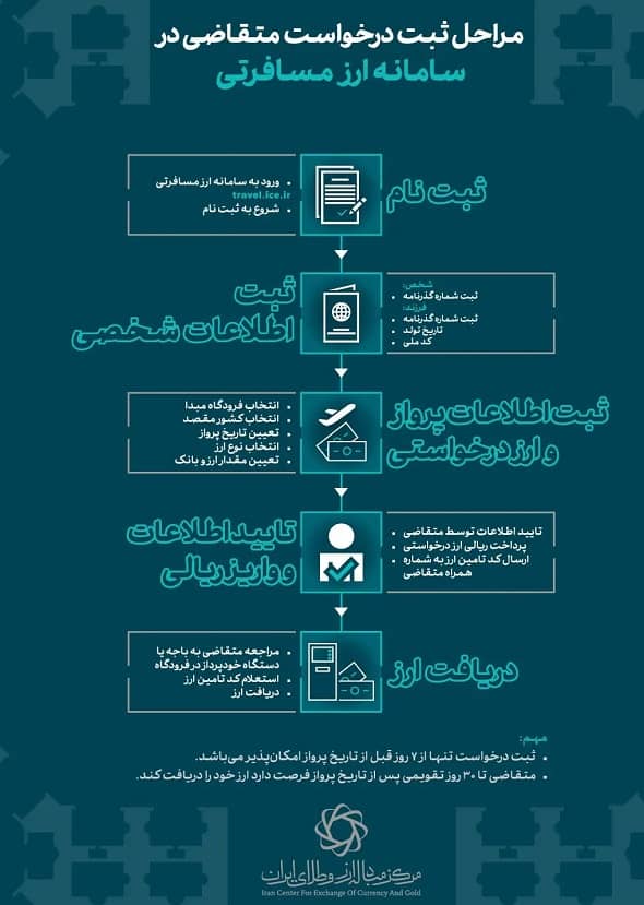 مسافران هوایی میتوانند از طریق سامانه ارز مسافرتی مرکز مبادله ارز و طلای ایران به نشانی اینترنتی travel.ice.ir نسبت به خرید ارز مسافرتی اقدام کنند. این سامانه درگاه رسمی تأمین ارز مسافرتی مورد تأیید بانک مرکزی است.